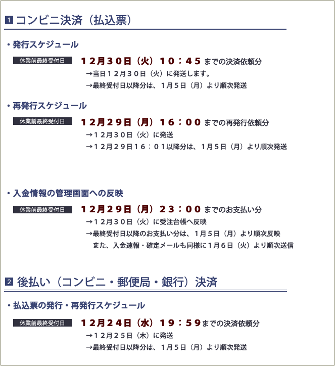 | コンビニ決済(払込票)」と「後払い(コンビニ・郵便局・銀行)決済の払込票発送スケジュールが変わります。また、郵便局の配送状況によっては、郵便物の到着が遅れる可能性もあります。